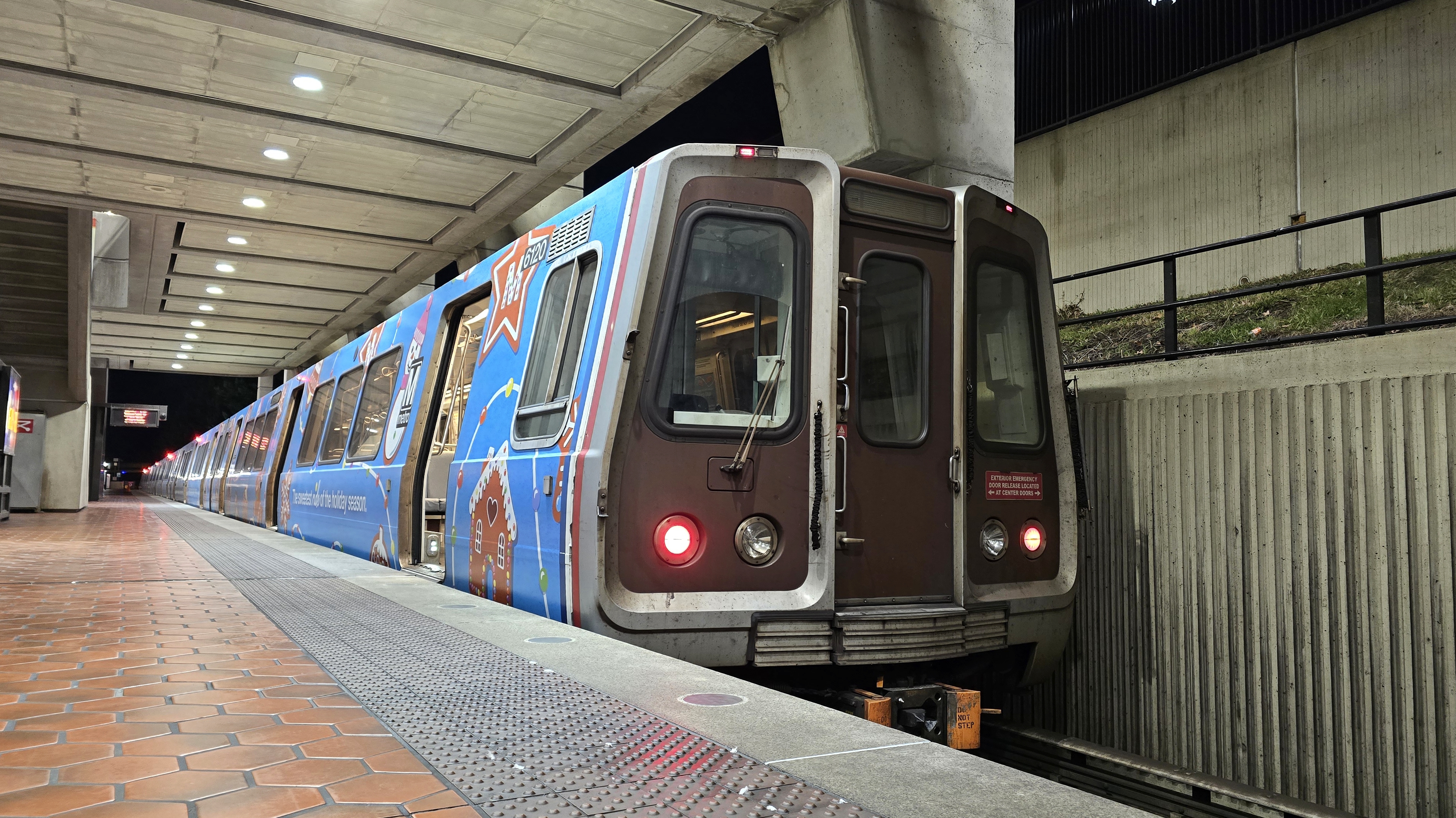 WMATA railcar 6120, decorated as part Metro's 2024 holiday train. Seen here at Branch Avenue.