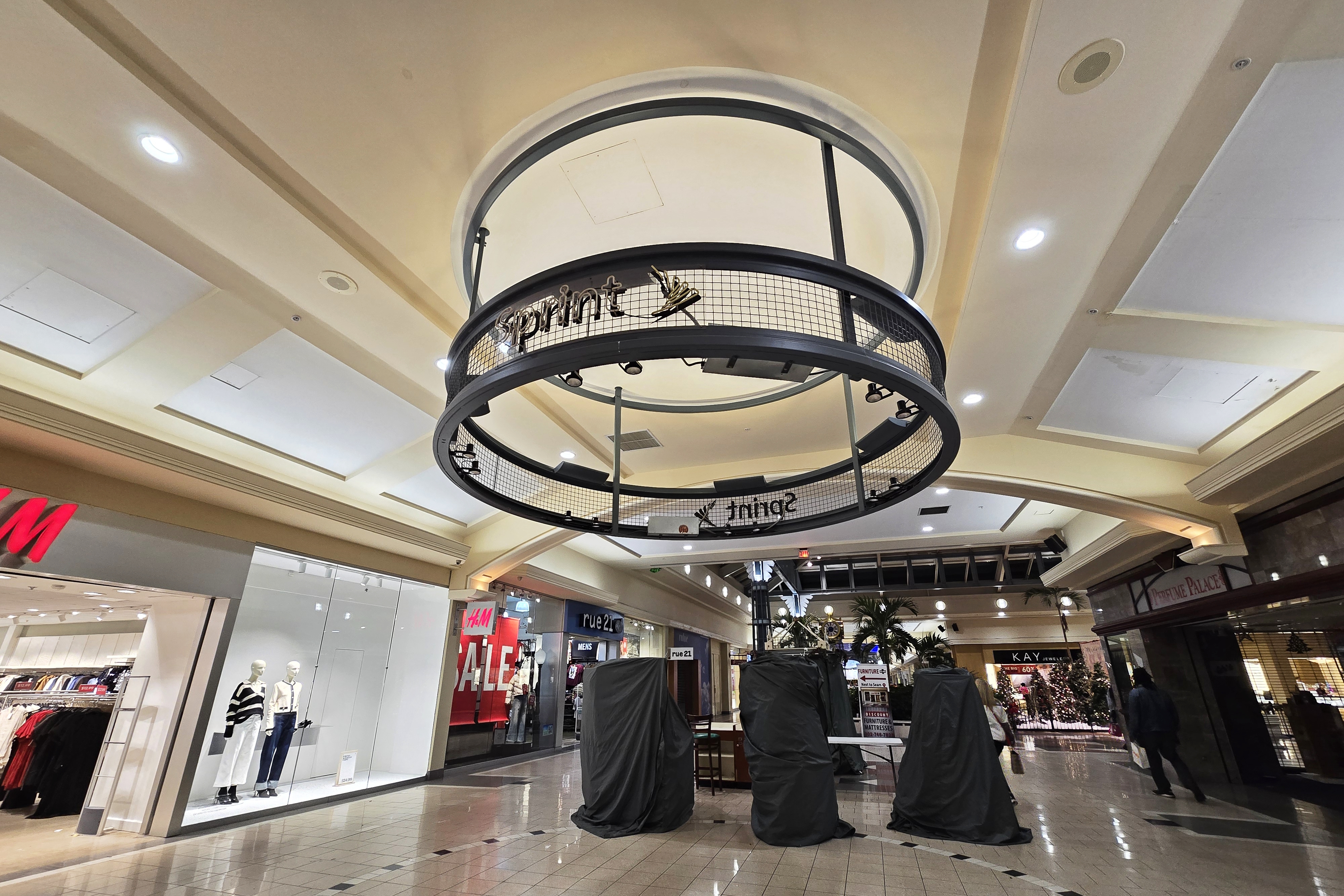 A circular neon sign for Sprint, which presumably once had a kiosk directly beneath it, at Concord Mall, a largely single-story shopping mall along US 202 near Wilmington, Delaware.