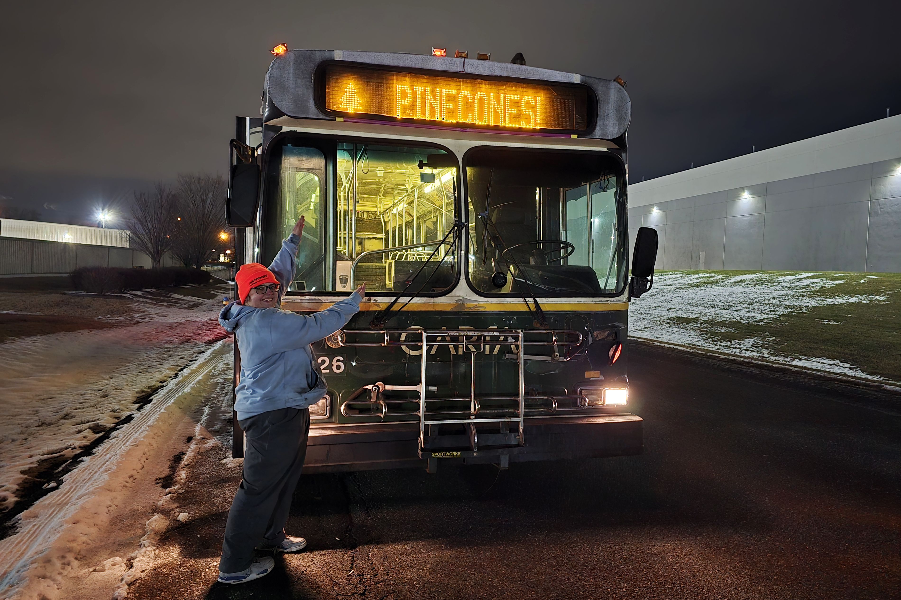 This photo shows Elyse Horvath showing off a custom sign message that she programmed for the bus that reads, "PINECONES!" with an image of a pine tree next to it.