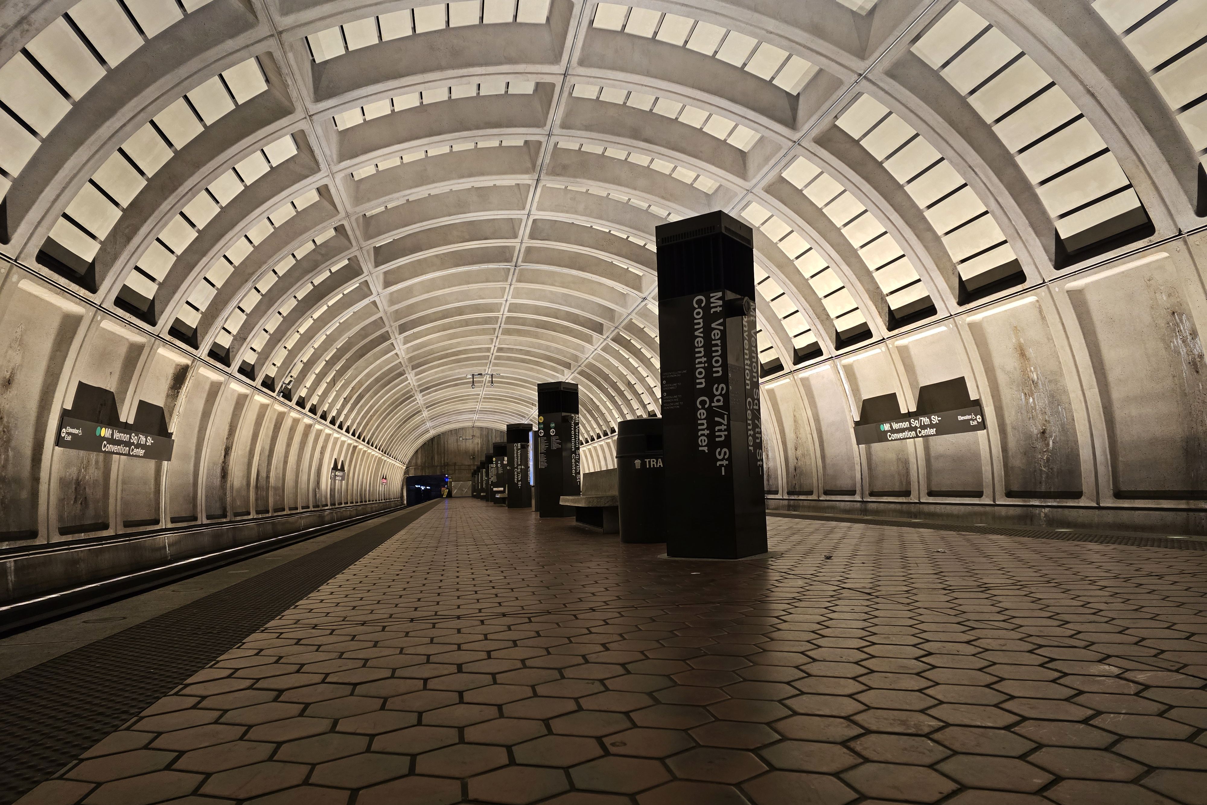 Mount Vernon Square, a station on the Green and Yellow Lines of the Washington Metro system. At the time that this photo was taken, the station was closed to the public due to security measures surrounding the presidential inauguration, which would occur the following day. Green Line trains in both directions passed the station without stopping, while northbound Yellow Line trains offloaded passengers at Gallery Place-Chinatown and then ran empty to Mount Vernon Square to turn around in the usual way before resuming passenger service towards Huntington at Gallery Place-Chinatown.