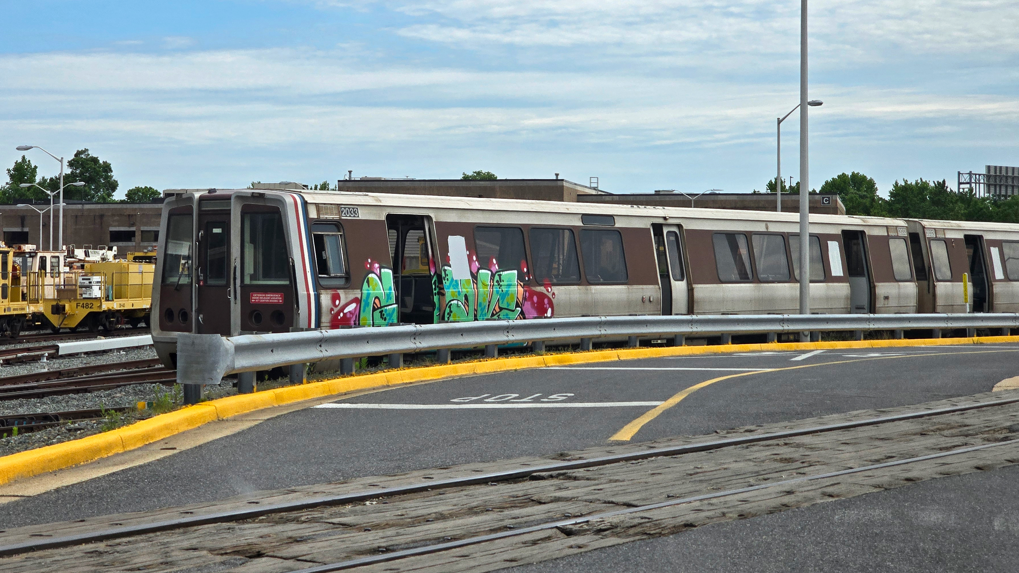WMATA railcar 2033 sits on the disposal track at the Greenbelt rail yard along with its mate, 2032. The car has been stripped of all usable parts and is now waiting to be loaded onto a truck for transport to Baltimore for scrapping.