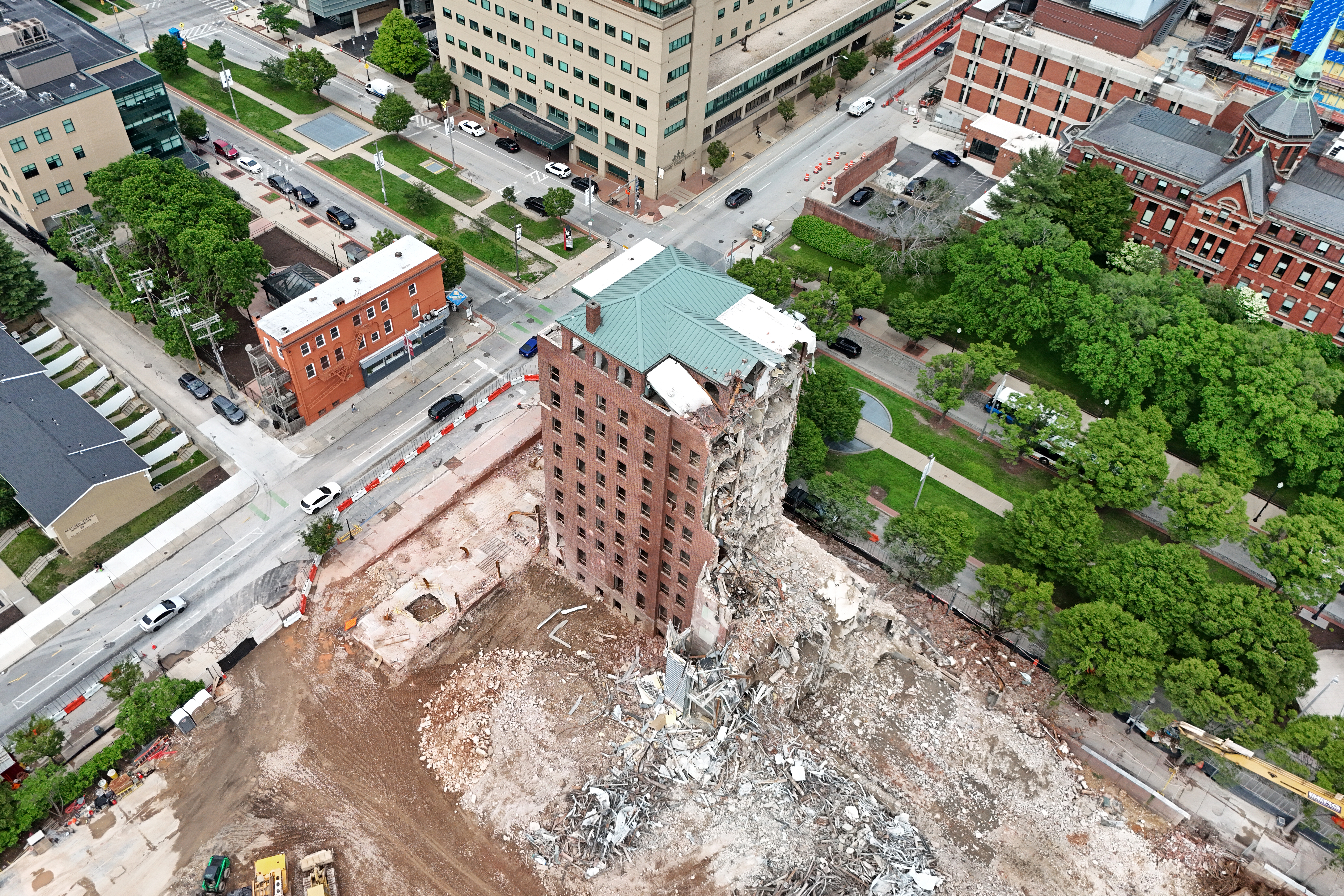 Demolition of Hampton House, a building that served the Johns Hopkins School of Medicine in Baltimore, Maryland from 1926 to 2025. The building was demolished in the spring of 2025 to make way for a new life sciences building.