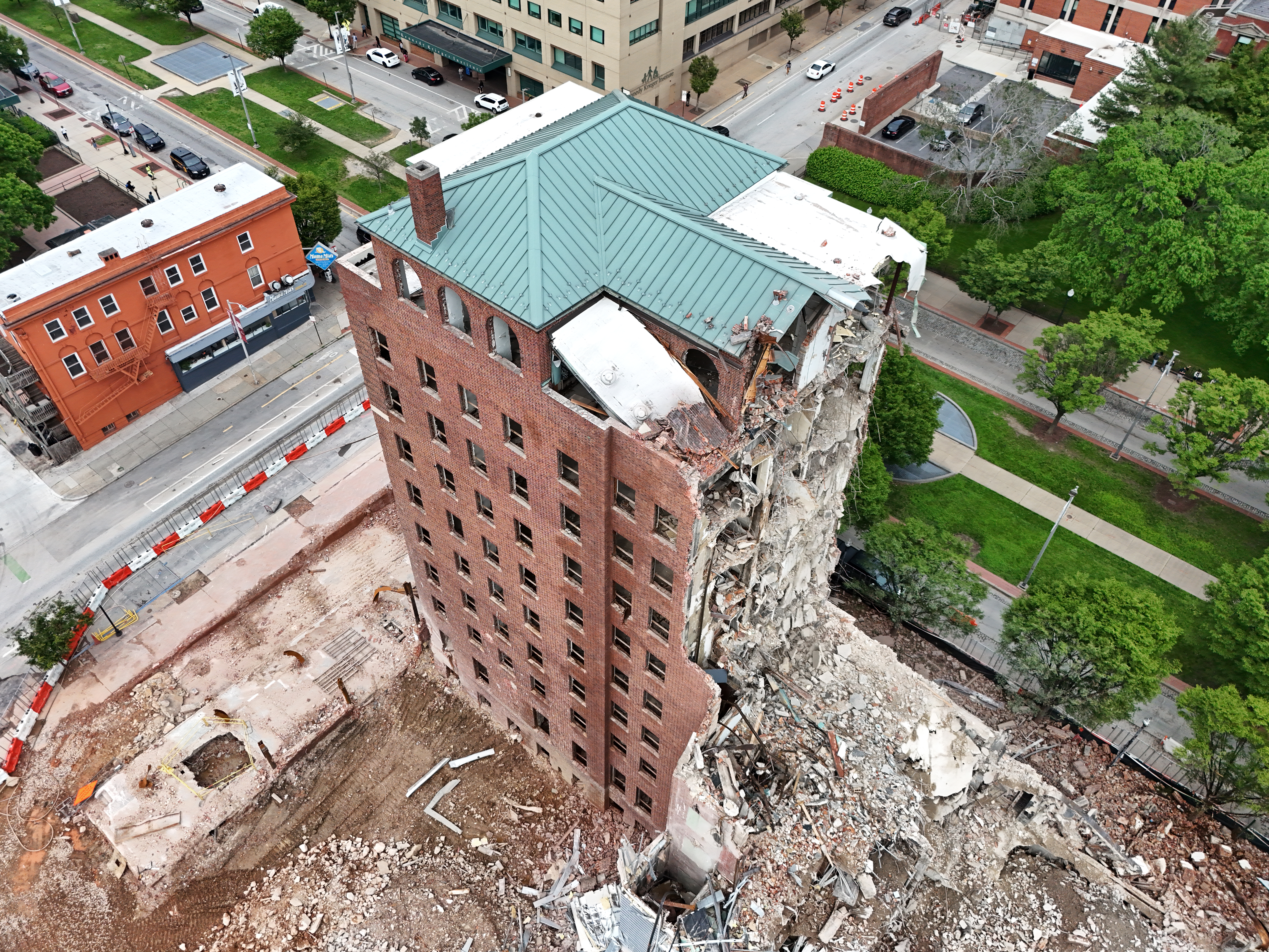 Demolition of Hampton House, a building that served the Johns Hopkins School of Medicine in Baltimore, Maryland from 1926 to 2025. The building was demolished in the spring of 2025 to make way for a new life sciences building.