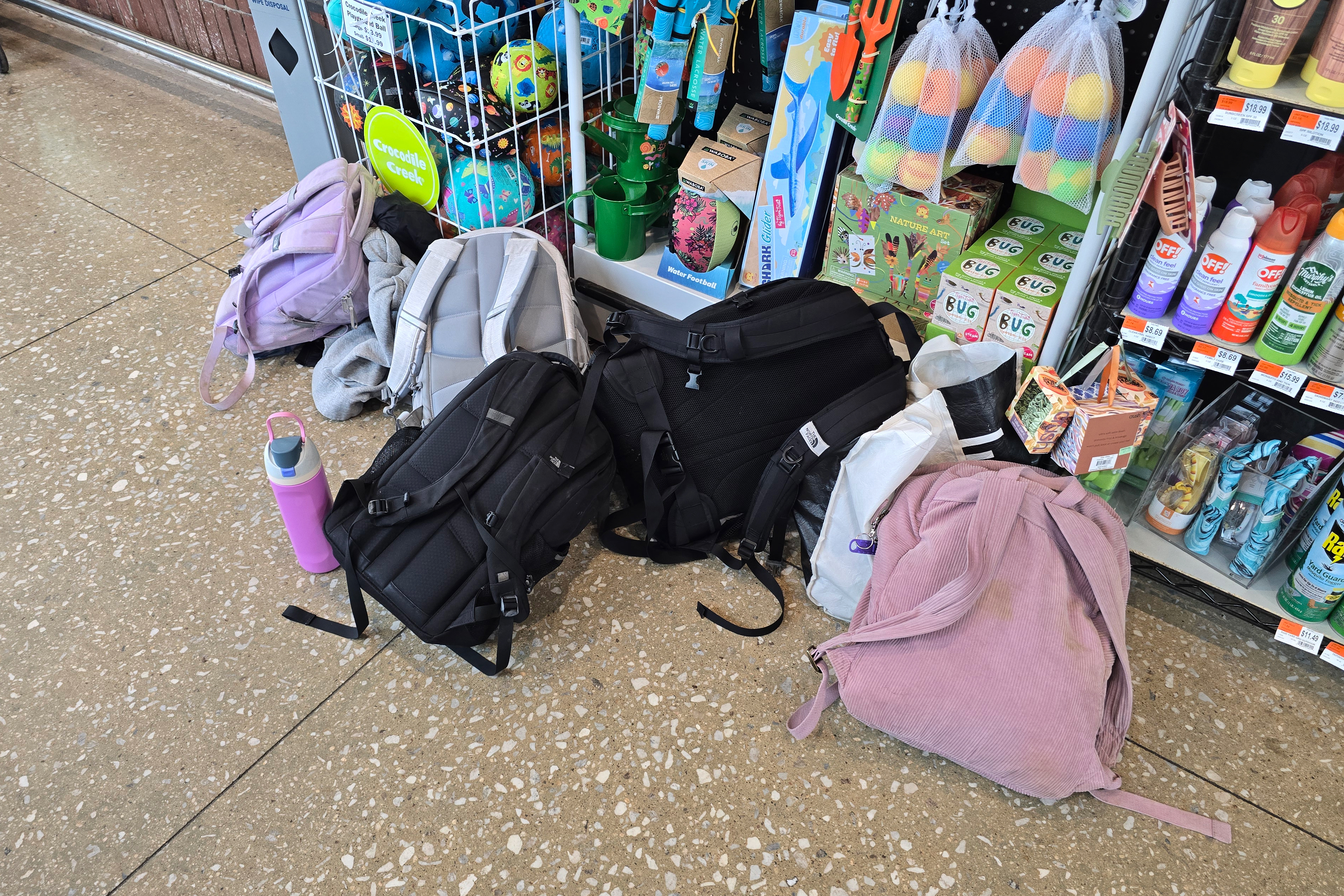 Unattended backpacks and other bags on the floor in the vestibule at Eddie's of Roland Park, a grocery store located at 5113 Roland Avenue in Baltimore, Maryland. This accumulation of bags occurs due to a store policy that prohibits backpacks and other bags in the store, ostensibly to prevent merchandise theft, and with nowhere else to leave these items while shopping, patrons simply leave their things on the floor in the entrance vestibule.