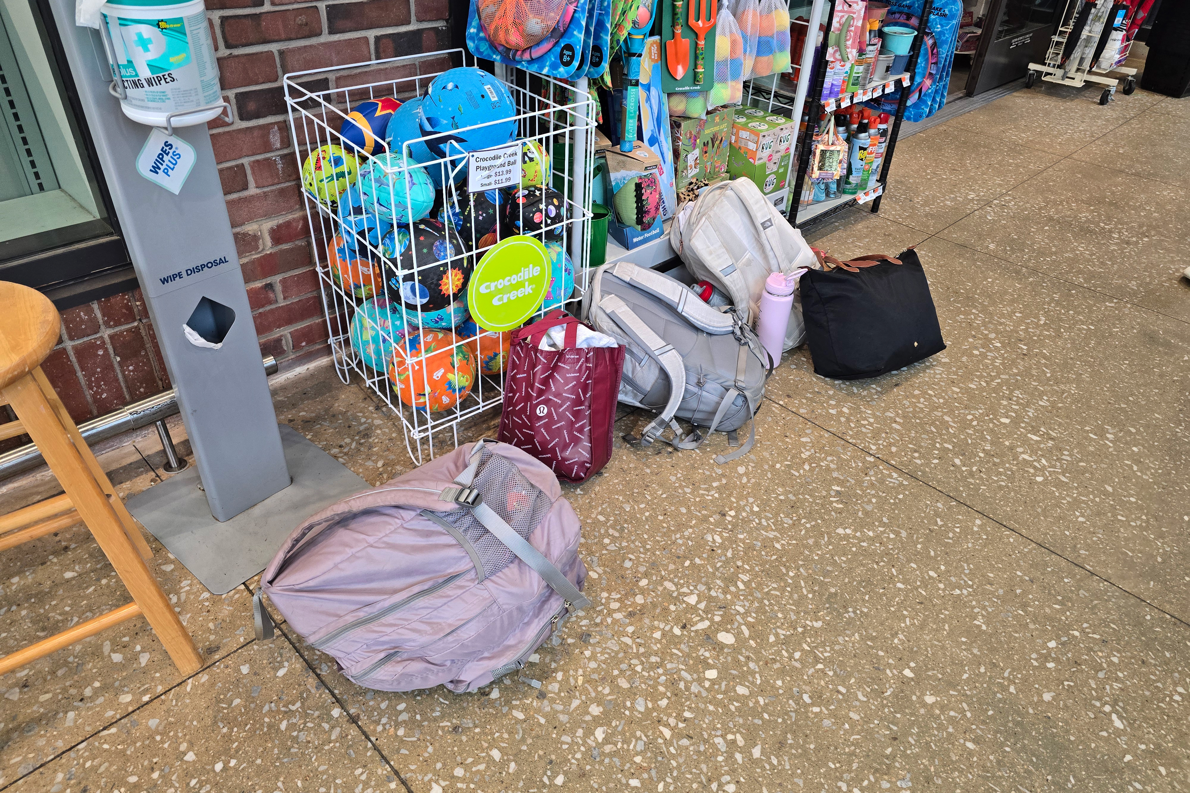Unattended backpacks and other bags on the floor in the vestibule at Eddie's of Roland Park, a grocery store located at 5113 Roland Avenue in Baltimore, Maryland. This accumulation of bags occurs due to a store policy that prohibits backpacks and other bags in the store, ostensibly to prevent merchandise theft, and with nowhere else to leave these items while shopping, patrons simply leave their things on the floor in the entrance vestibule.